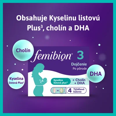 Femibion 3 je špecificky vyvinutý tak, aby podporoval Vás¹ a Vaše dieťa² po narodení. Po narodenía počas dojčenia Vaše dieťa začína štádium významného vývoja. Okrem Kyseliny listovej Plus³(kyselina listová a L-metylfolát) a cholínu obsahuje Femibion 3 aj omega-3 mastnú kyselinuDHA na podporu normálneho vývoja mozgu, očí a zraku dojčeného dieťaťa.²