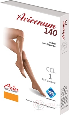 Podporné lýtkové pančuchy AVICENUM 140 patria svojím tlakom do I. kompresnej triedy. Majú zosilenú pätu. Antimikrobiálan úprava Sanitized Silver chráni pred vznikom nepríjemných pachov. Zloženie 69 % Nylon, 31 % elastan Lycra.