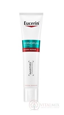 "Eucerin DermoPure CLINICAL Obnovujúci krém je intenzívne hydratačný krém vhodný na upokojenie podráždenej pleti a zmiernenie vedľajších, silne vysušujúcich účinkov liečby akné. Obsahuje unikátnu kombináciu upokojujúceho Symsitive¹ a ceramidov, ktoré podporujú ochrannú bariéru pleti a znižujú stratu hydratácie.