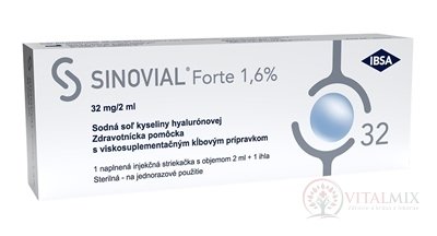 SINOVIAL® Forte 1,6 % je zdravotnícka pomôcka určená na integráciu synoviálnej tekutiny, ktorá umožňuje obnoviť fyziologické a reologické vlastnosti kĺbov postihnutých artrózou. SINOVIAL® Forte 1,6 % v kĺbe znižuje bolesť a podporuje obnovu súvisiacej pohyblivosti kĺbov a šliach, pričom pôsobí iba v synoviálnej dutine, do ktorej sa injekčne podáva.
