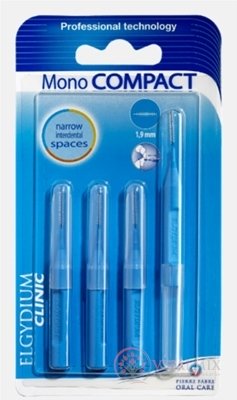 Medzizubné kefky ELGYDIUM CLINIC MONO COMPACT úzke 1,9 mm (modrá rukoväť) sú vďaka tenkým drôtikom a kvalitným vláknam Tynex ® vhodné na čistenie ťažko prístupných miest