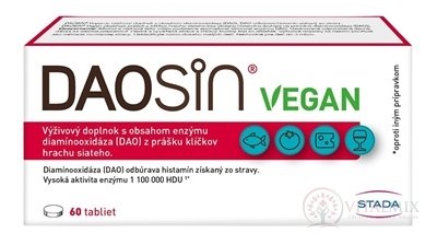 Požitím jednej tablety DAOSiN® Vegan pred jedlom sa zvýši množstvo DAO, a tým sa v tráviacom trakte prirodzenou aktivitou DAO z klíčkov hrachu siateho urýchli premena histamínu z potravy. Jedna tableta DAOSiN® Vegan má aktivitu 1 100 000 HDU (1 100 kHDU, histamín degradujúcich jednotiek). Tri tablety DAOSiN® Vegan majú aktivitu 3 300 kHDU.