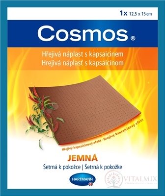 COSMOS hrejivá náplasť s kapsaicínom JEMNÁ je určená pre ochranu a zahriatie pokožky. Teplo, ktoré je tvorené kapsaicínom, vytvára príjemný pocit úľavy a relaxácie. Variant JEMNÁ obsahuje nižší obsah kapsaicínu.