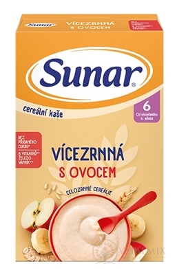 Sunar cereálna kaša viaczrnná s ovocím je vhodná ako príkrm pre deti od ukončeného 6. mesiaca. Obsahuje celozrnné cereálie, ktoré prispievajú k pestrému jedálničku malých detí. Bez pridaného cukru, vhodná na rozvoj zdravých stravovacích návykov už od útleho veku.