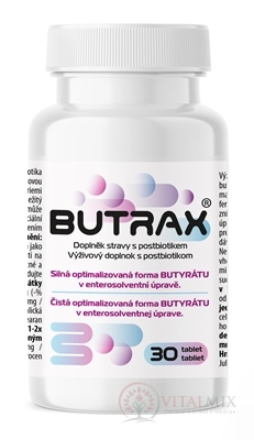 Výživový doplnok Butrax® je určený pre doplnenie postbiotika butyrátu. Butyrát predstavuje elementárnu krátko reťazcovú mastnú kyselinu (SCFA). Je produkovaná hlavne baktériami fermentujúcimi vlákninu v čreve a jeho množstvo môže byť znížené pri nerovnováhe črevnej mikrobioty. Enterosolventná úprava chráni butyrát pred nízkým pH v žalúdku a zaisťuje jeho presun do čreva.