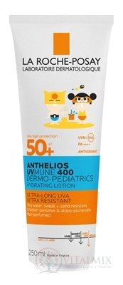 LA ROCHE-POSAY Anthelios UVMune400 Dermo-pediatrics hydratačné mlieko SPF50+ pre ochranu proti dlhovlnnému UVA žiareniu. Na tvár a telo. Veľmi vysoká ochrana proti UVB/UVA + ultradlhovlnnému UVA žiareniu. Zachováva prirodzenú obranyschopnosť pokožky. Na pokožke nezanecháva biele škvrny. Testované pod dermatologickou a pediatrickou kontrolou.