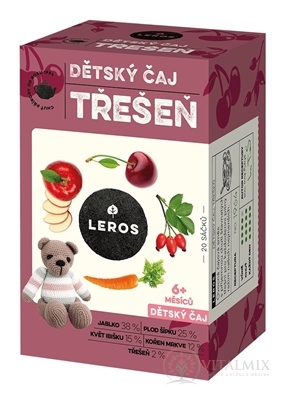 Leros Detský čaj Čerešňa, ovocný čaj aromatizovaný s príchuťou čerešne, v čajových vreckách. Vyvážená zmes vysoko kvalitných bylín a plodov, šetrných k detskému zažívaniu, vhodná na doplnenie pitného režimu detí i dospelých. Príjemnú chuť dotvára koreň mrkvy a granulovaného plodu čerešne v kombinácii s prírodnou čerešňovou arómou. V letných mesiacoch odporúčame čaj podávať vlažný alebo chladený.