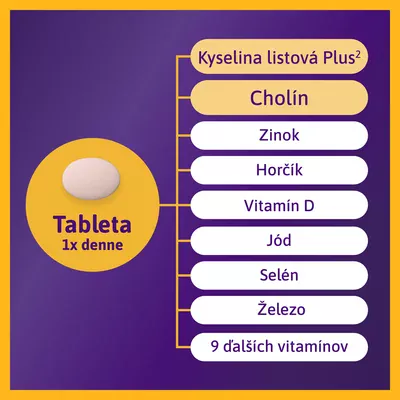 Tableta Femibion® 1 tiež obsahuje: cholín, vitamíny B1, B2, B6, B12, C, D, E, biotín, niacín, kyselinu pantoténovú, jód, železo a selén.