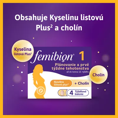 Femibion 1 poskytuje cholín, Kyselinu listovú Plus² (kyselina listová a L-metylfolát), vitamíny a minerály, ktorých potreba sa u tehotných žien zvyšuje, a prispieva tak k normálnemu vývoju plodu.¹ Je tiež obohatený o ďalšie látky na podporu zdravia Vášho tela počas plánovania tehotenstva a po počatí¹ vrátane železa, horčíka a vitamínu D.