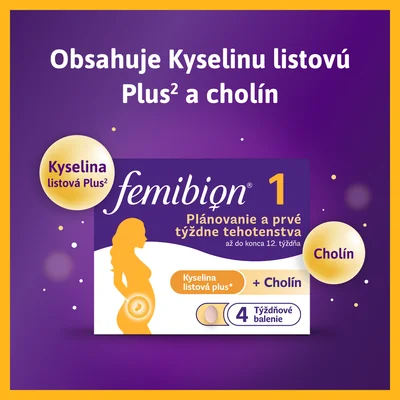 Femibion 1 poskytuje cholín, Kyselinu listovú Plus² (kyselina listová a L-metylfolát), vitamíny a minerály, ktorých potreba sa u tehotných žien zvyšuje, a prispieva tak k normálnemu vývoju plodu.¹ Je tiež obohatený o ďalšie látky na podporu zdravia Vášho tela počas plánovania tehotenstva a po počatí¹ vrátane železa, horčíka a vitamínu D.